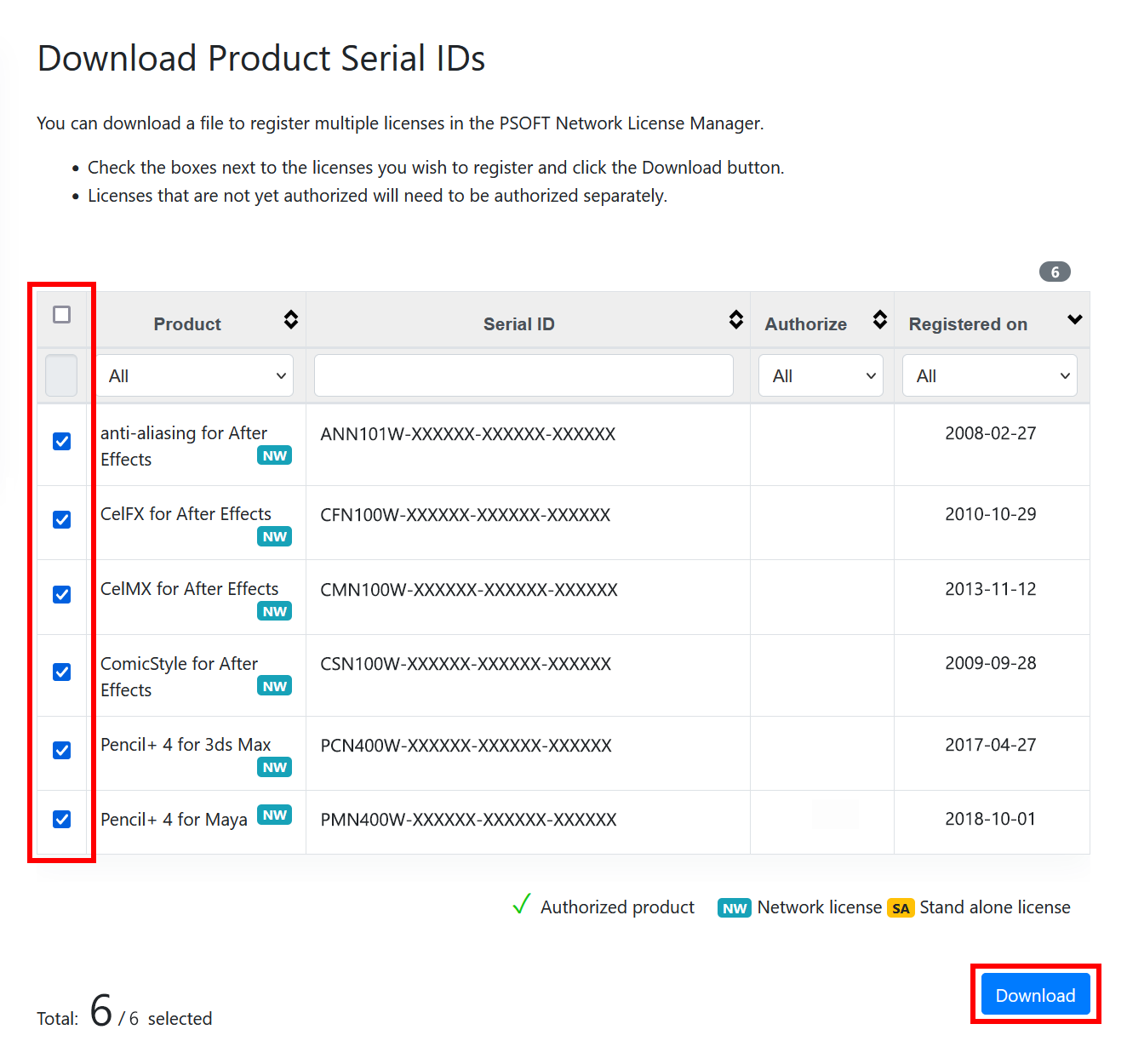 Step 3:Check in the boxes next to the products you wish to add to the license server and click [Download].¶