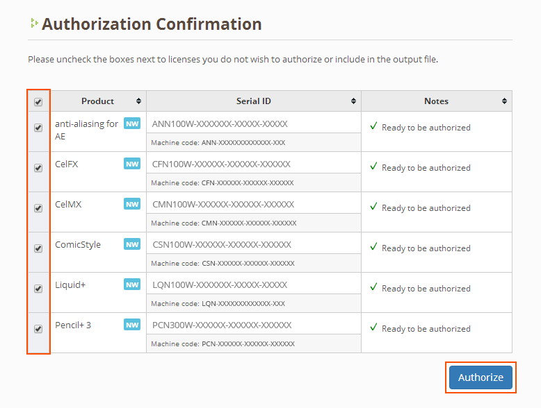 Step 1: Select the licenses you wish to authorize (you can select multiple licenses) and click [Authorize].¶