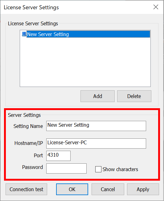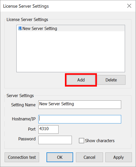 Finish editing the NLM server settings by pressing [Apply] to apply the edits or by pressing [OK] to apply and close the [License Server Settings] window.