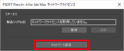3ds Max または Maya のメニューバーから [Pencil+ 4] - [ライセンス] をクリックし、[Pencil+ 4 Network License] ダイアログの [ネットワーク設定] ボタンをクリックします。