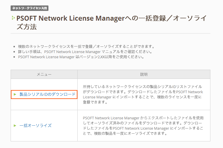各製品のネットワークライセンス版のライセンス取得方法は下記のリンクを御覧ください。