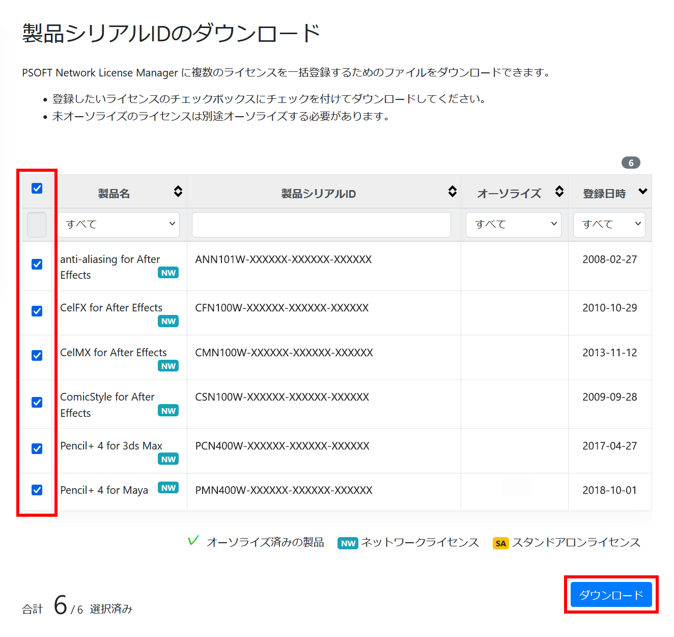 3. ライセンスサーバーに追加したい製品にチェックを入れ、 [ダウンロード] ボタンをクリックします。