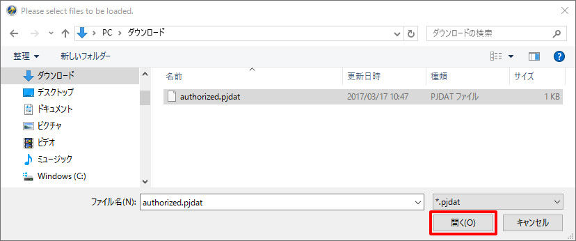 6. 手順3でダウンロードしたファイルを指定し、[開く(O)] をクリックします。