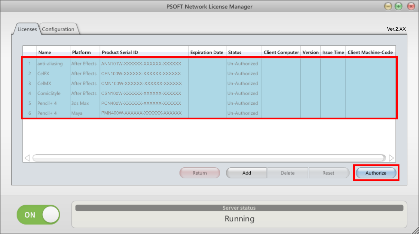 1. オーソライズしたいライセンスを選択(複数選択可)し、 [Authorize] ボタンをクリックします。