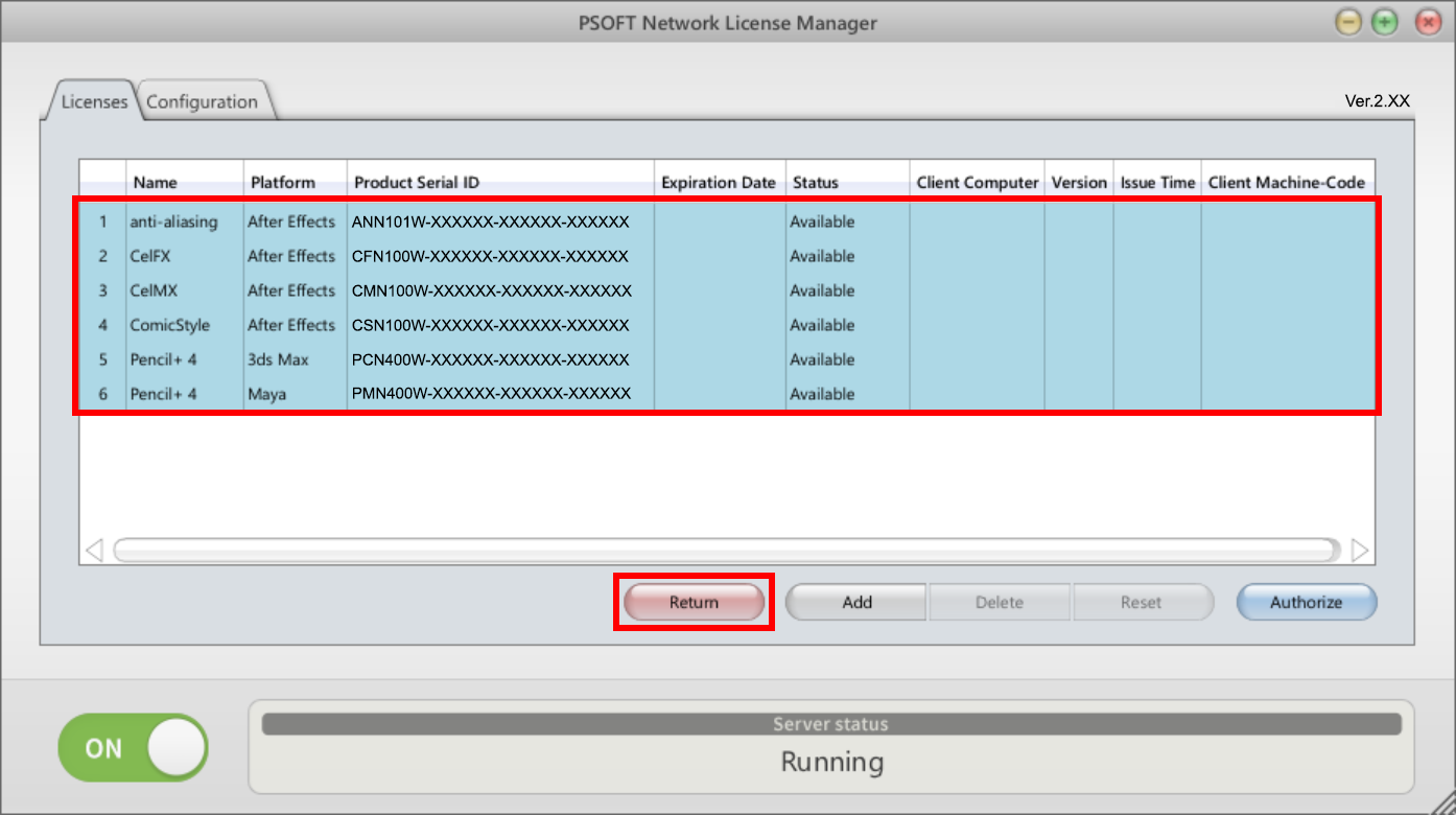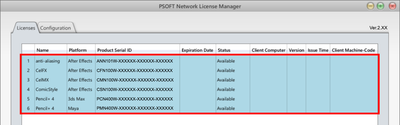 PSOFT Network License Manager のリストで Ctrl + A を押すと、全てのライセンスを選択してまとめて返還できます。