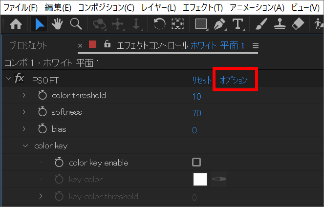 1. エフェクトコントロールパネルの"オプション"をクリックし [option(オプション)] ダイアログを開いてください。