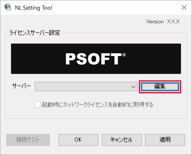 1. 「NL Setting Tool」を起動して [編集] をクリックし、[ライセンスサーバー設定] ダイアログを開きます。