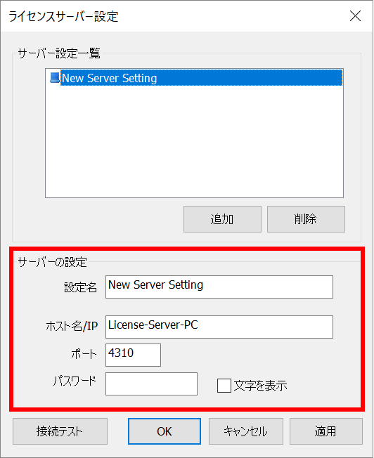 編集後 [適用] ボタンを押して編集を確定するか、[OK] ボタンで [ライセンスサーバー設定] ダイアログを閉じて NLM サーバーの設定を完了します。
