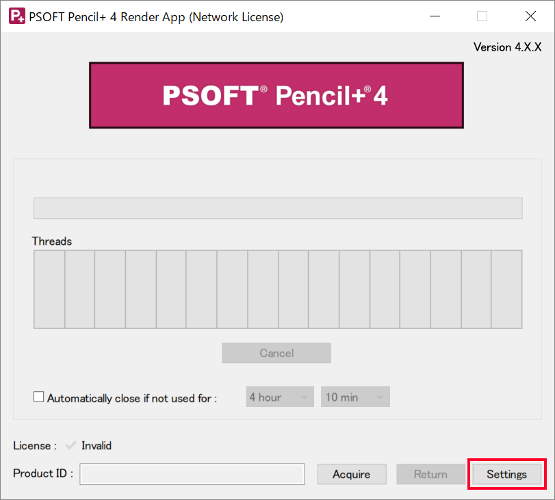 Pencil+ 4 Render App を起動し、ダイアログの [Settings] ボタンをクリックします。