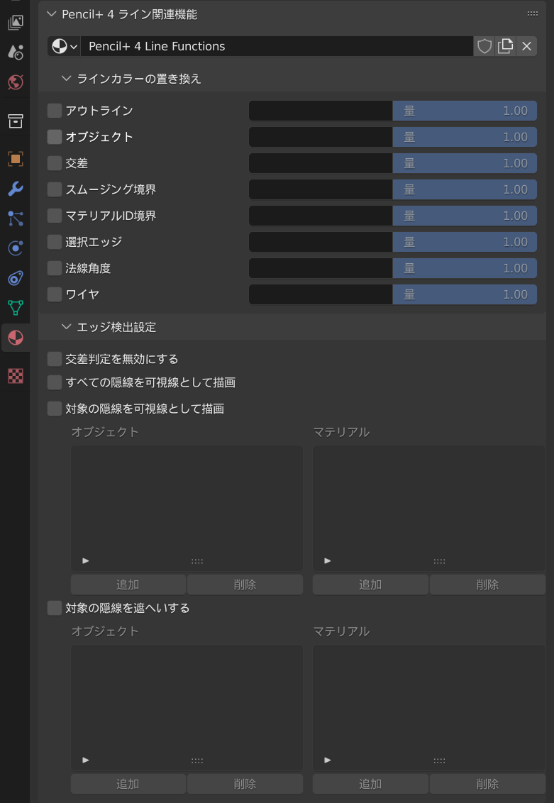 ライン関連機能はラインの設定をマテリアル単位で変更する補助的な機能です。基本的には Pencil+ 4 ラインを使用してラインの設定を行うことを想定していますが、シーン内で特殊な設定が必要になった場合にマテリアル単位でラインに関する設定ができます。