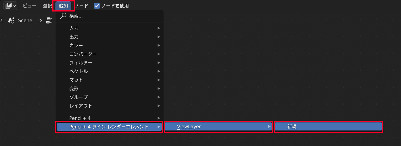 コンポジターエディターのメニューから [追加] を選択し、 [Pencil+ 4 ライン レンダーエレメント]-[ViewLayer]-[New] を選択すると、 [Pencil+ 4.Line Render Element.ViewLayer] ノードが新規で追加されます。