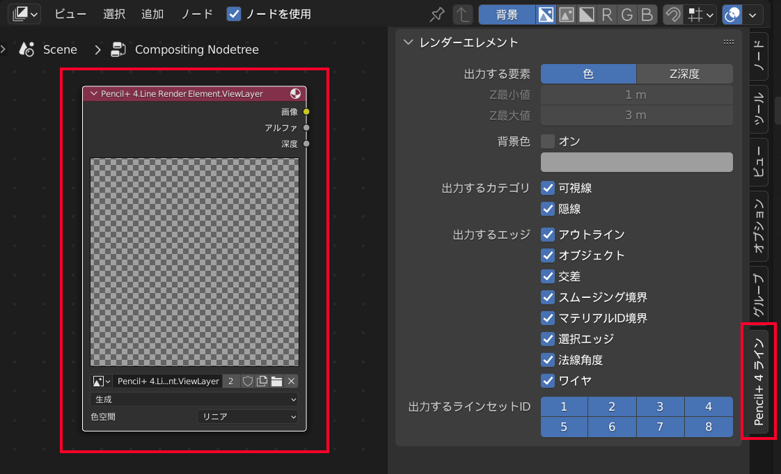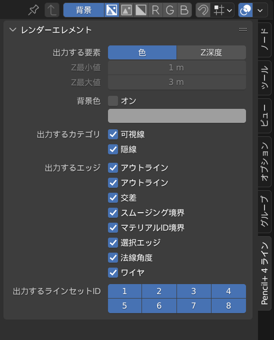 レンダーエレメントはラインの要素を個別に出力するための機能です。 コンポジターエディターに Pencil+ 4 ライン レンダーエレメント ビューレイヤーを追加して、サイドバーの [Pencil+ 4 ライン] タブの [レンダーエレメント] パネルから設定を行います。