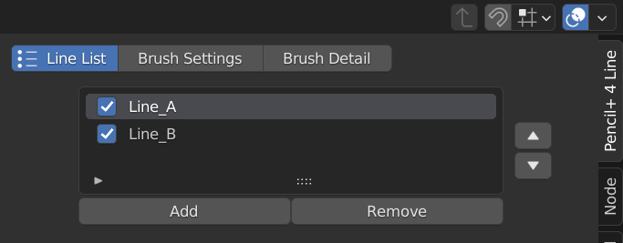 그리기 대상의 [라인 노드] 를 표시합니다. 여러 개가 설정된 경우 여러 개의 라인이 그려집니다. 리스트는 [렌더링 우선순위] 값이 낮은 순서대로 표시합니다. [라인 노드] 가 여러 개일 경우, 노드를 하나하나 리스트의 순서대로 계산을 실행합니다. 이 때문에 [라인 노드] 수가 많으면 Pencil+ 라인이 하나인 경우보다 렌더링 시간이 느려질 수 있습니다. 라인 노드 이름 앞에 있는 체크박스는 라인 노드의 [활성화] 상태를 설정할 수 있습니다. 라인 이름을 더블 클릭하면 노드 이름을 변경할 수 있습니다.