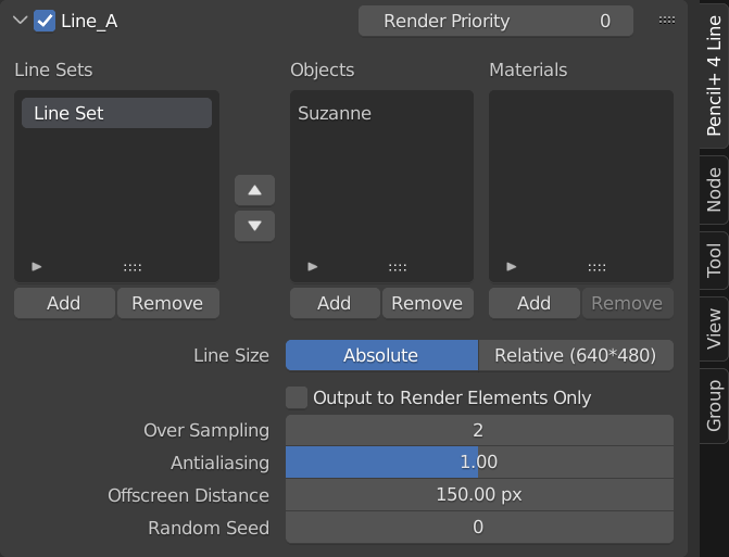 [라인 노드] 이름 앞에 있는 체크박스에서 Pencil+ 4 라인 렌더링의 활성화/비활성화를 설정합니다. 꺼져 있으면 선을 그리지 않습니다.