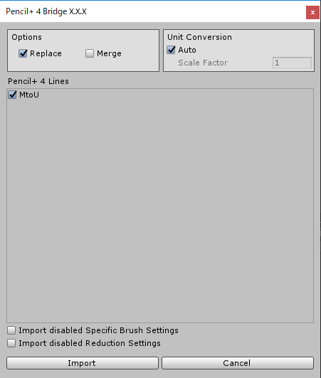 入力したスケール率に従って数値を変換します。 Pencil+ 4 Bridge for 3ds Max と Pencil+ 4 Bridge for Maya の初期リリースバージョンを使用してエクスポートされたファイルをインポートする場合など、自動的な変換が機能しない場合などに使用します。