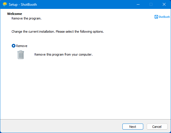 제거(언인스톨) 방법 제거 방법 1¶ Windows 제어판의 '프로그램 및 기능'에서 'PSOFT ShotBooth'를 선택하고 [제거(Remove)] 버튼을 클릭합니다. 제거 방법 2¶ 설치 파일(setup_ShotBooth_1.x.x..exe)을 다시 실행한 뒤, 표시되는 대화상자에서 [제거(Remove)]가 선택되어 있는지 확인하고 [다음(Next)] 버튼을 클릭합니다.