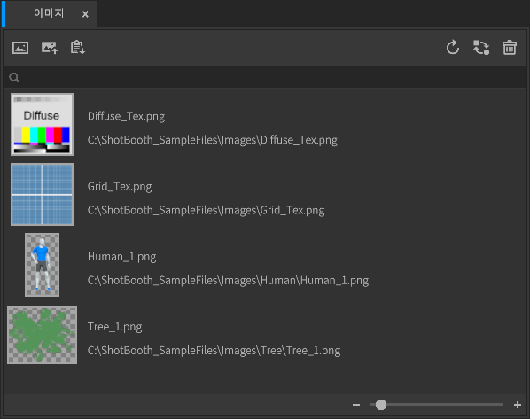 ShotBooth 는 프로젝트 파일에 이미지를 직접 포함하지 않고, 파일 경로를 저장합니다. 불러온 원본의 이미지를 수정한 경우, 이 버튼으로 변경 사항을 씬(Scene)에 반영할 수 있습니다.
