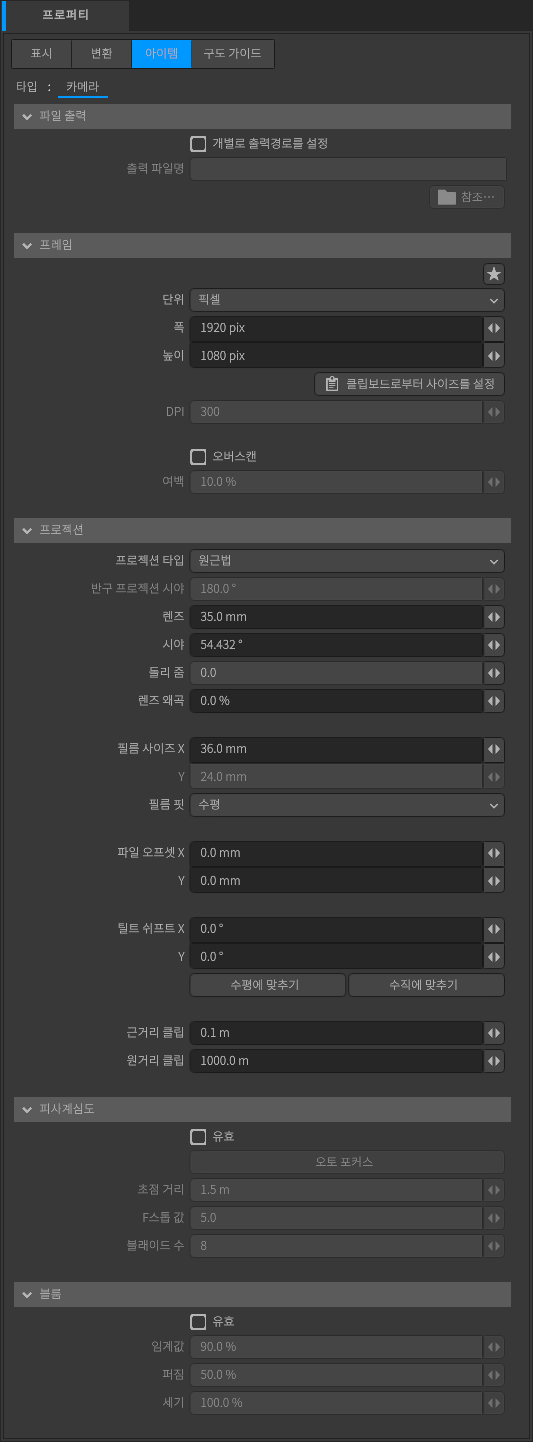 - 카메라 아이템 이름은 렌더링 이미지의 출력 파일 이름으로 사용됩니다.