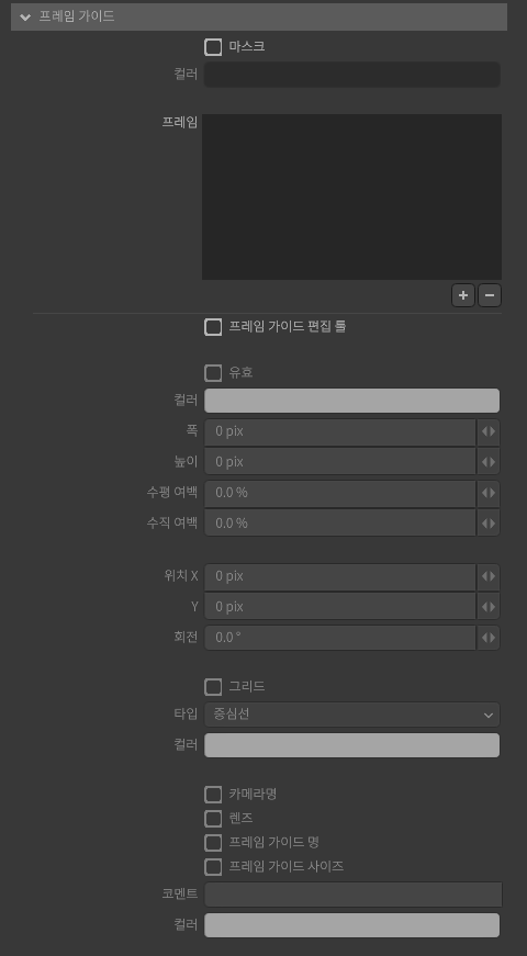 +아이콘을 클릭하면 리스트에 프레임 가이드를 생성합니다.-아이콘을 클릭하면 리스트에서 프레임 가이드를 삭제합니다.- 행을 클릭하면 프레임 가이드를 선택합니다.