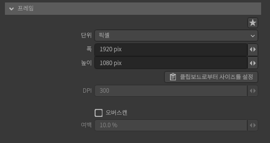 클립보드의 이미지 크기에 맞춰 [너비] [높이]를 설정합니다. [단위]가 픽셀일 때만 사용할 수 있습니다. 렌더링 이미지의 크기를 만화의 컷 등 2D 이미지의 크기에 맞추고 싶을 때 사용하는 것을 전제로 한 기능입니다.
