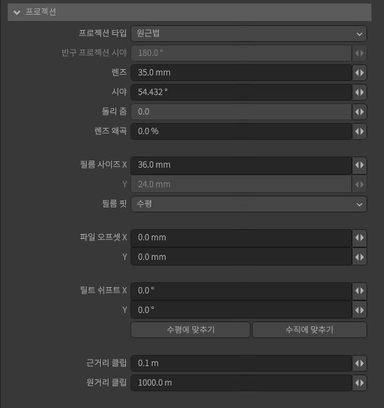 카메라의 투영 방법을 선택할 수 있습니다. ShotBooth 의 카메라는 렌즈의 밀리미터 수와 같은 일반적인 카메라 파라미터 외에 [프로젝션 타입]이나 [필름 오프셋]과 같은 작화에 적합한 기능을 갖추고 있습니다.