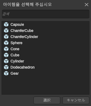 씬 내에서 사용할 수 있는 아이템이 리스트로 표시됩니다. 리스트에서 아이템을 선택하고 [선택] 버튼을 클릭하면, 선택한 아이템을 [소스 아이템]으로 설정할 수 있습니다.