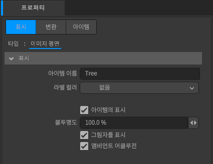이미지 평면에 사용할 이미지를 선택합니다. 이미지 드롭다운을 클릭하면 이미지 리스트에 불러온 이미지가 나열됩니다.