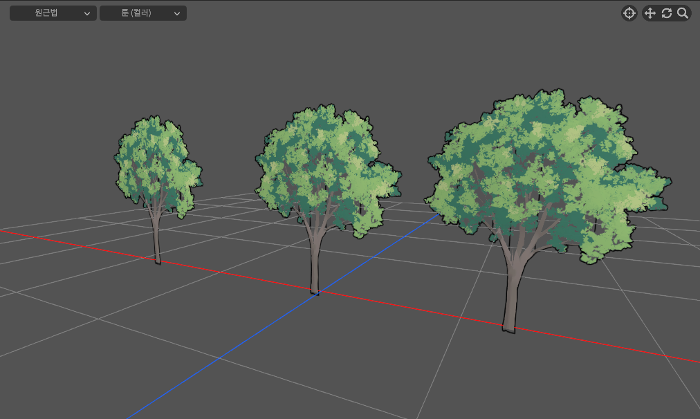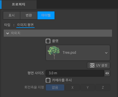 이미지 평면은 2D의 풀이나 나무 등을 3D 공간에 배치하기 위한 기능입니다. [카메라를 주시]를 사용하면 항상 카메라를 정면으로 향하게 할 수 있습니다.