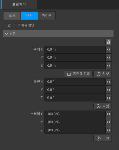 스케일 X / Y / Z 값을 모두 100%로 설정합니다. 스케일한 아이템을 원래 크기로 되돌릴 때 사용합니다.