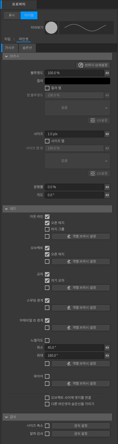 버튼을 클릭하면 브러시의 세부적인 설정을 할 수 있는 [브러시 상세 설정]을 엽니다. 이 브러시 설정은 라인셋의 각 [에지]에서 기본 브러시 설정으로 사용됩니다. 에지의 [개별 브러시 설정 버튼] 체크박스를 [활성화] 하면 이 브러시 설정은 무시됩니다.