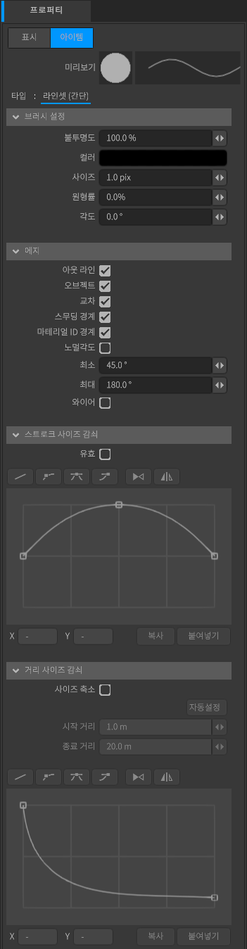 거리 사이즈 감쇠를 활성화합니다. 커브 UI를 사용하여 직관적으로 라인의 굵기를 제어할 수 있습니다.