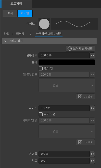 브러시 설정은 [라인 셋] [브러시 상세 설정]과 연동하여 라인의 색과 굵기를 설정하는 계층입니다.