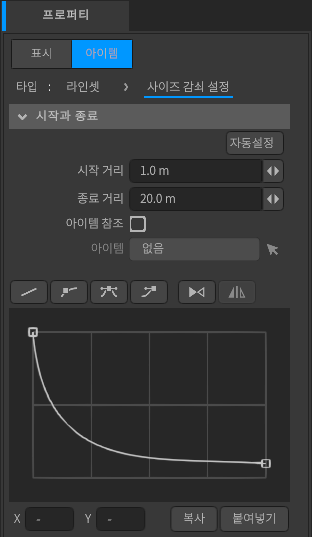 감쇠 설정에 관한 설정을 하는 계층입니다. 커브를 사용하여 직관적으로 라인의 굵기나 불투명도의 감쇠를 설정할 수 있습니다.