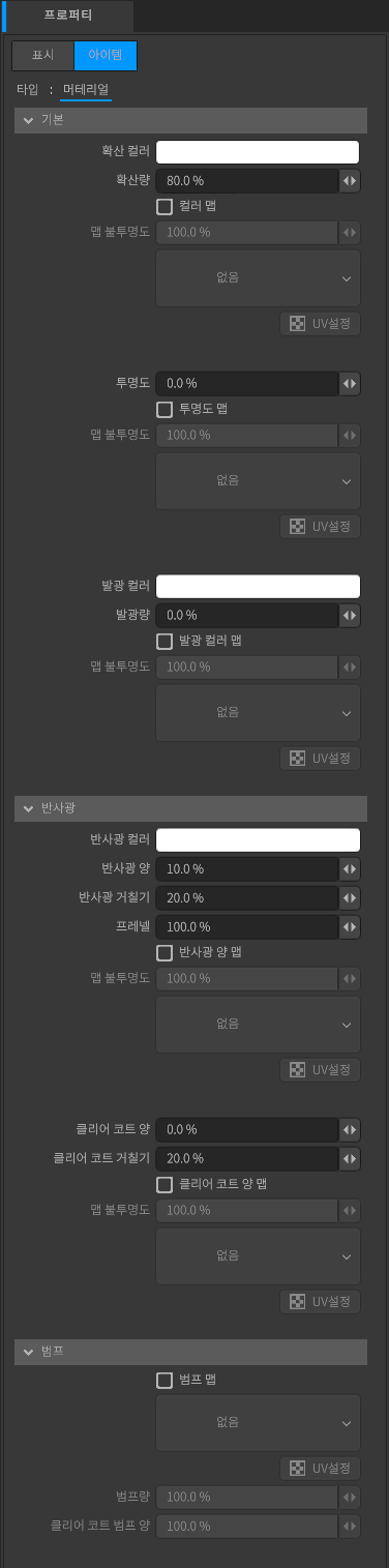 머티리얼은 메시 아이템의 질감을 설정합니다. 금속, 고무, 유리, 자동차 도장과 같은 광택이나 반사를 설정할 수 있습니다.