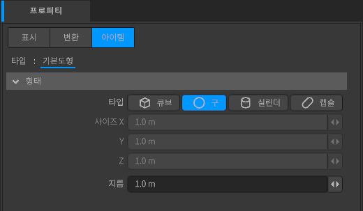 - 이 프로퍼티는 [타입]이 [큐브] [실린더] [캡슐]일 때에 편집할 수 있습니다.