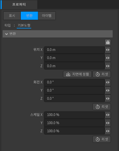 스케일 X / Y / Z 값을 모두 100%로 설정합니다. 스케일한 아이템을 원래 크기로 되돌릴 때 사용합니다.