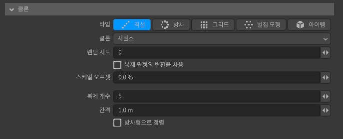 복제 모양, 복제 수, 복제 간격을 설정합니다.