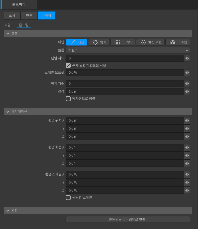 복제한 아이템의 [위치] [회전] [스케일]에 무작위성을 더합니다.