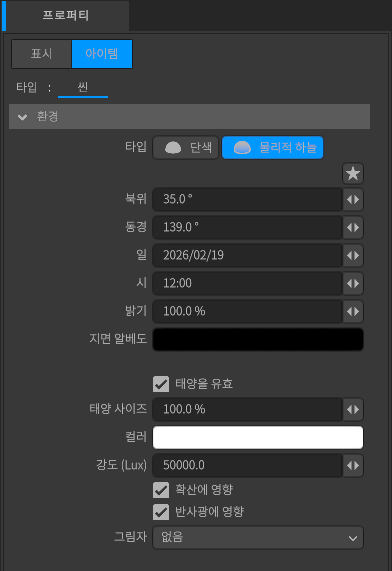 하늘의 밝기를 설정합니다. [밝기]는 [강도 (Lux)]와 연동됩니다. [밝기]를 사용하면 조명의 [강도 (Lux)]를 약하게 하여 하늘만 밝은 상태로 설정할 수 있습니다.