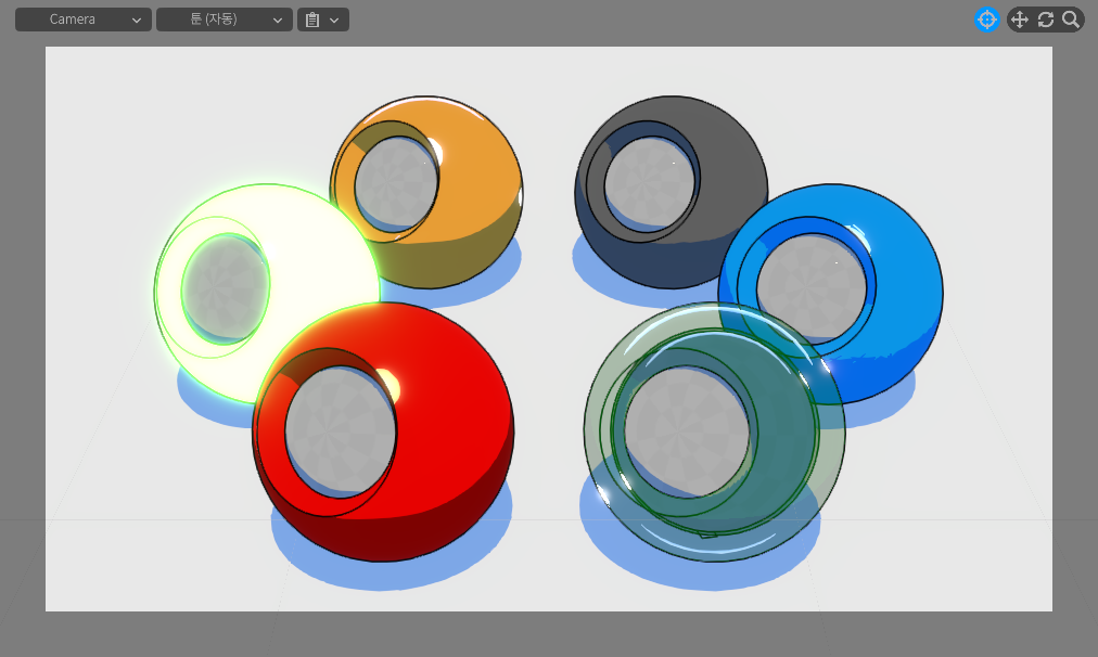 3D 뷰포트의 [뷰 셰이딩]을 전환하면 머티리얼의 프로퍼티를 기반으로 한 툰 머티리얼로 변환하여 뷰포트에 표시합니다.