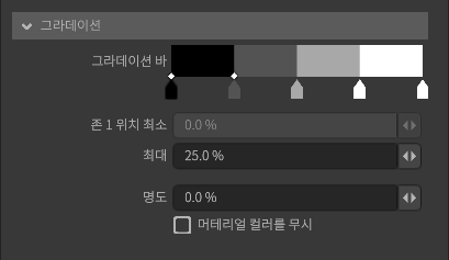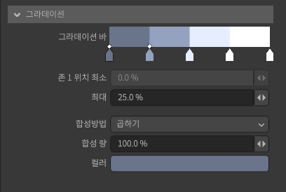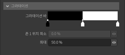 - [최소] [최대] 프로퍼티는 [그라데이션 바]의 색상 플래그 위치와 동기화됩니다.
