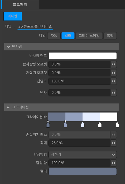 - 기본적으로 머티리얼의 [디퓨즈 색상]에 그라데이션을 [곱하기]로 합성합니다.