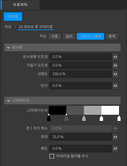 그레이스케일의 그라데이션 바를 사용하여 툰 표시를 조절합니다. 만화 등 그레이스케일 그림을 만들기 위한 머티리얼입니다.